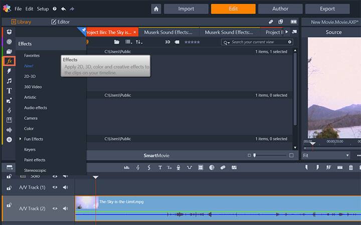 From the Edit tab, click the Navigation bar for the Library panel, and choose Effects.